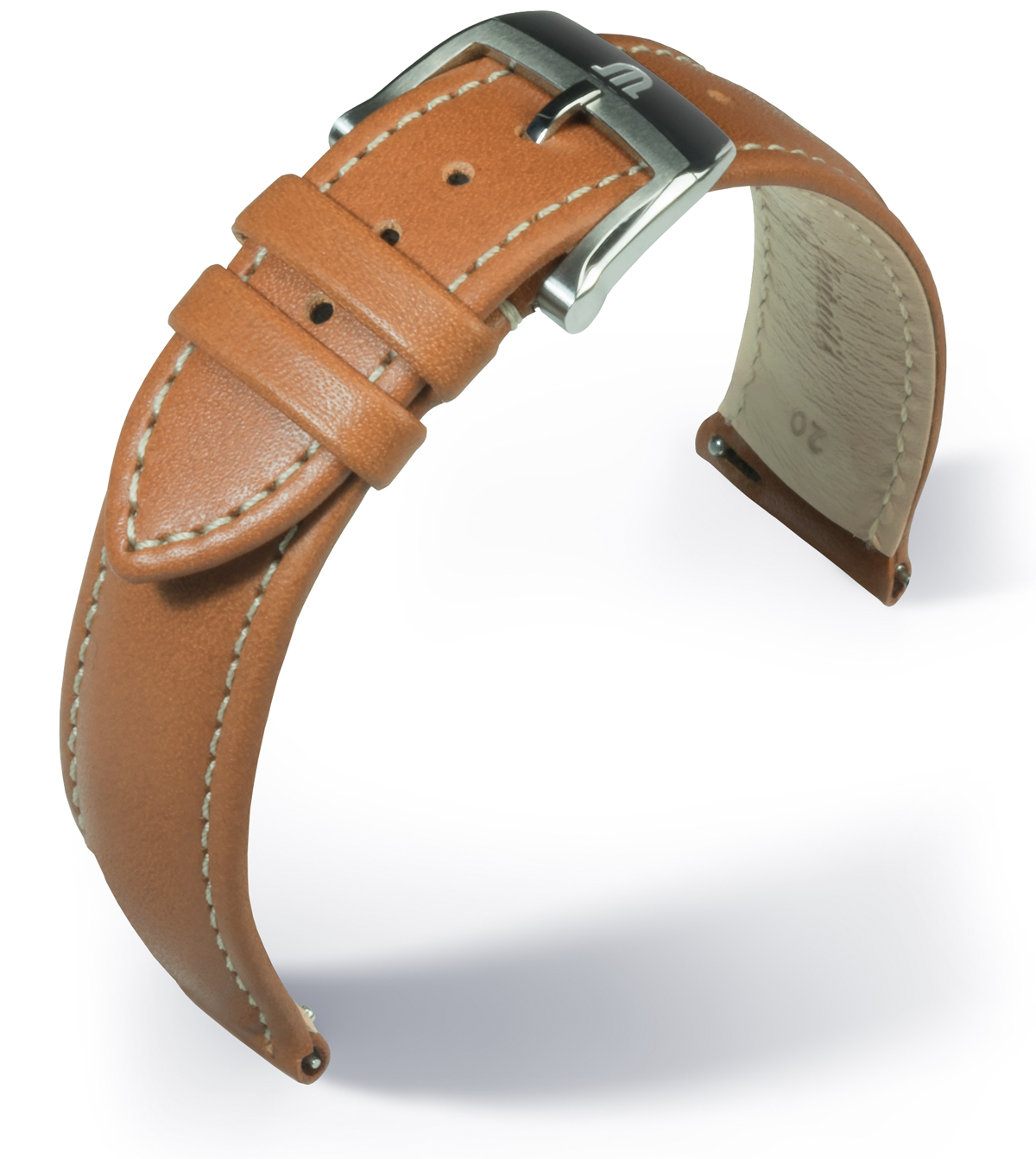 Seidenmattes Uhrarmband aus feinem Kalbleder gefertigt. Rembordierte Ausführung mit leichter Polsterung, Maurice Lacroix-Symbol versenkt. Inclusive Wechselfederstegen und neuer Eliros-Dornschließe.