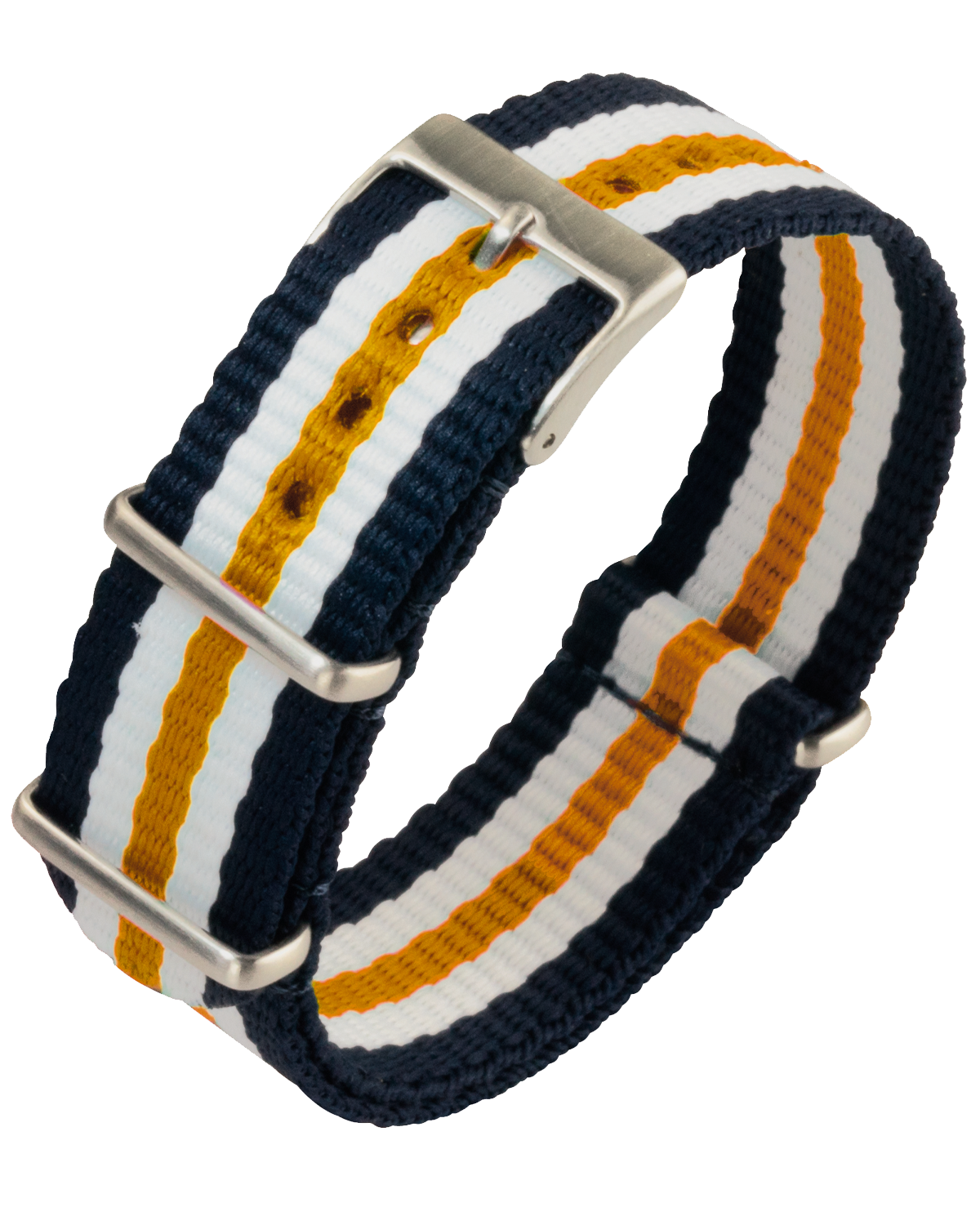 Gewobenes Nylon-Band im beliebten Nato-Style. Breite 20 mm. Alle Ränder und Dornlöcher werden speziell versiegelt um Ausfransen zu verhindern. Die robusten Edelstahl-Schlaufen und die Schließe sind fest im Band eingenäht. Ein stabiles, langlebiges und hochwertig verarbeitetes Uhrenarmband.