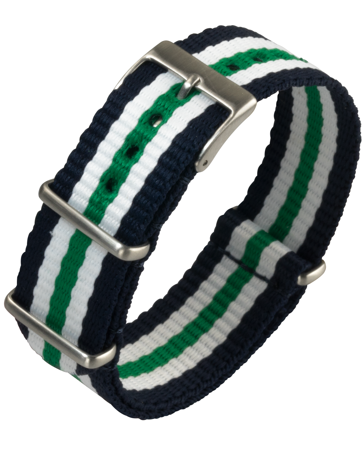 Gewobenes Nylon-Band im beliebten Nato-Style. Breite 20 mm. Alle Ränder und Dornlöcher werden speziell versiegelt um Ausfransen zu verhindern. Die robusten Edelstahl-Schlaufen und die Schließe sind fest im Band eingenäht. Ein stabiles, langlebiges und hochwertig verarbeitetes Uhrenarmband.