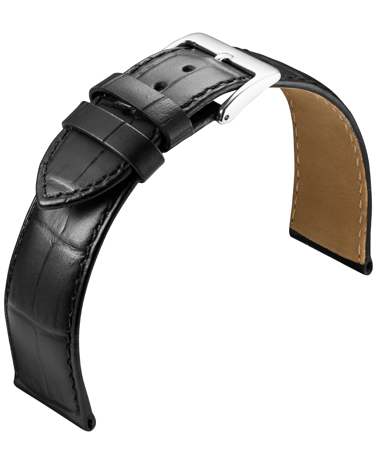 Louisiana-Kroko Optik auf Kalbleder geprägt. Leicht gepolstertes Band mit Naht und hautfreundlichem Futterleder, sowie Aluminium-Dornschließe.