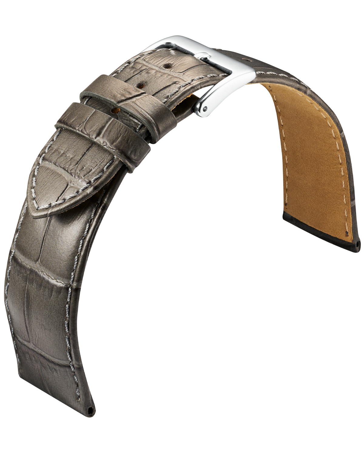 Louisiana-Kroko Optik auf Kalbleder geprägt. Leicht gepolstertes Band mit Naht und hautfreundlichem Futterleder, sowie Aluminium-Dornschließe.