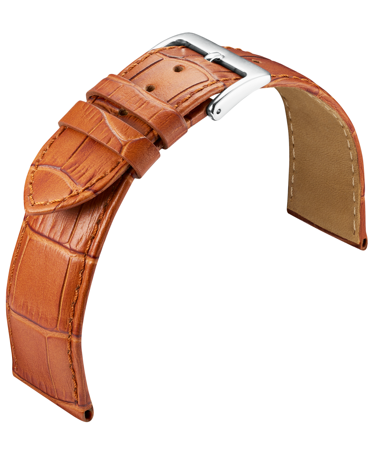 Louisiana-Kroko Optik auf Kalbleder geprägt. Leicht gepolstertes Band mit Naht und hautfreundlichem Futterleder, sowie Aluminium-Dornschließe.