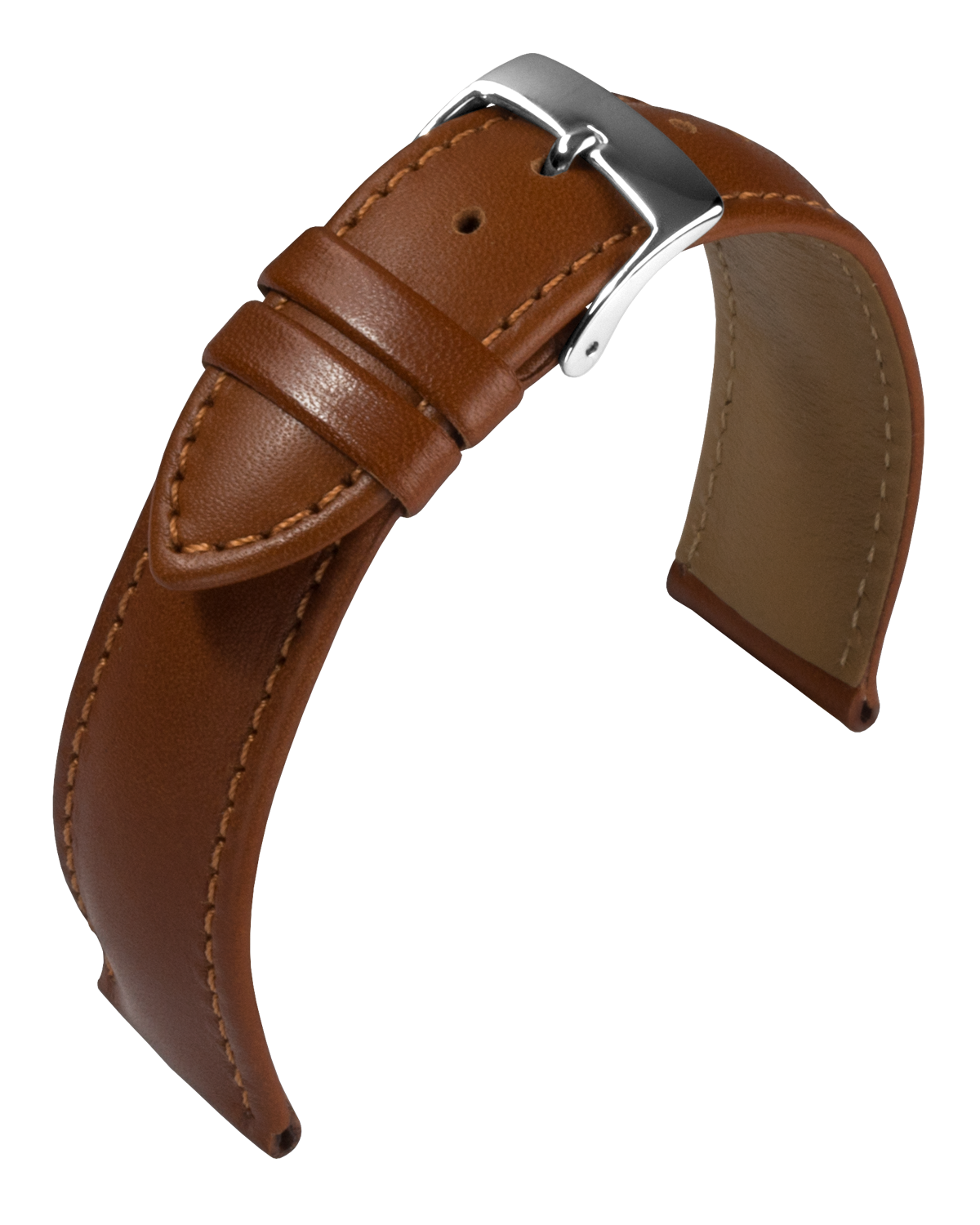 Hochwertiges, feines Kalbleder-Uhrarmband mit seidenglänzender Oberfläche. Rembordierte Ausführung, leicht gepolstert, hautfreundliches Nubuk-Futterleder und Edelstahl-Dornschließe.
