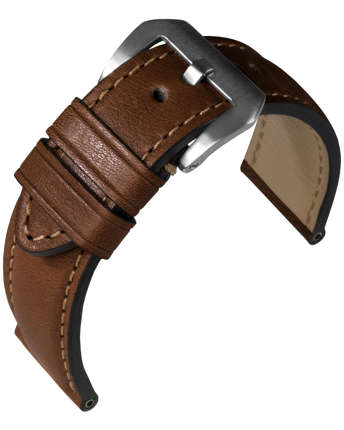 Hochwertiges Uhrarmband aus genarbtem Rindleder mit außergewöhnlicher Haptik. Das hautfreundliche Futterleder sorgt für angenehmen Tragekomfort, während die kräftige Naht den robusten Charakter unterstreicht. Die zusätzliche Seitennaht an der Schließe und eine vernähte Schlaufe unterstreichen die hohe Verarbeitungsqualität. Sorgfältig veredelte, farblich abgesetzte Schnittkanten runden das hochwertige Gesamtbild ab.