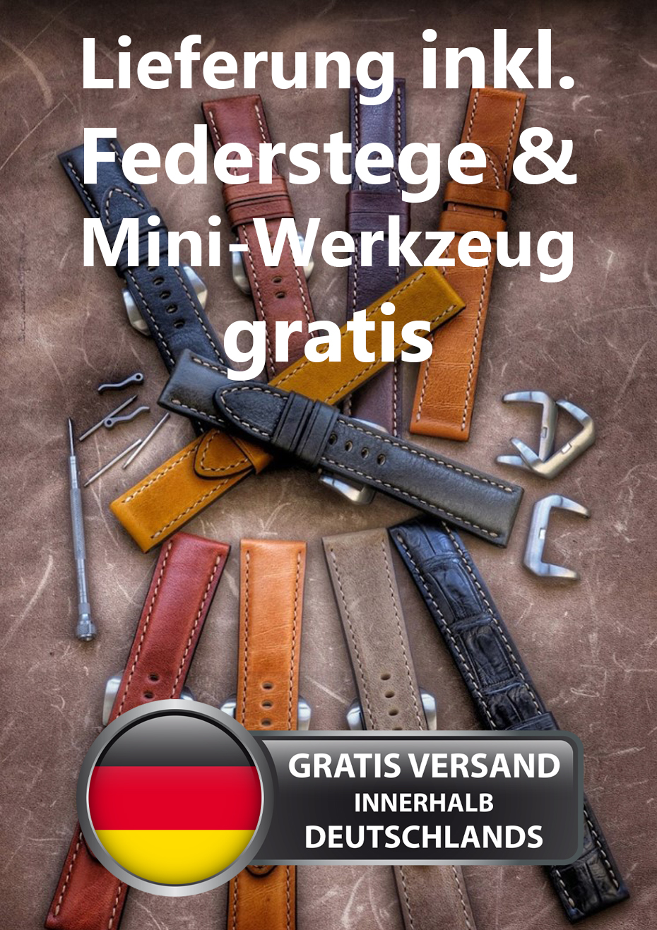 Keine Versandkosten bei Versand innerhalb Deutschlands! Mit jedem Uhrarmband liefern wir gratis ein Paar Federstege aus Edelstahl und ein Mini-Werkzeug zur einfachen Montage des Uhrarmbandes.