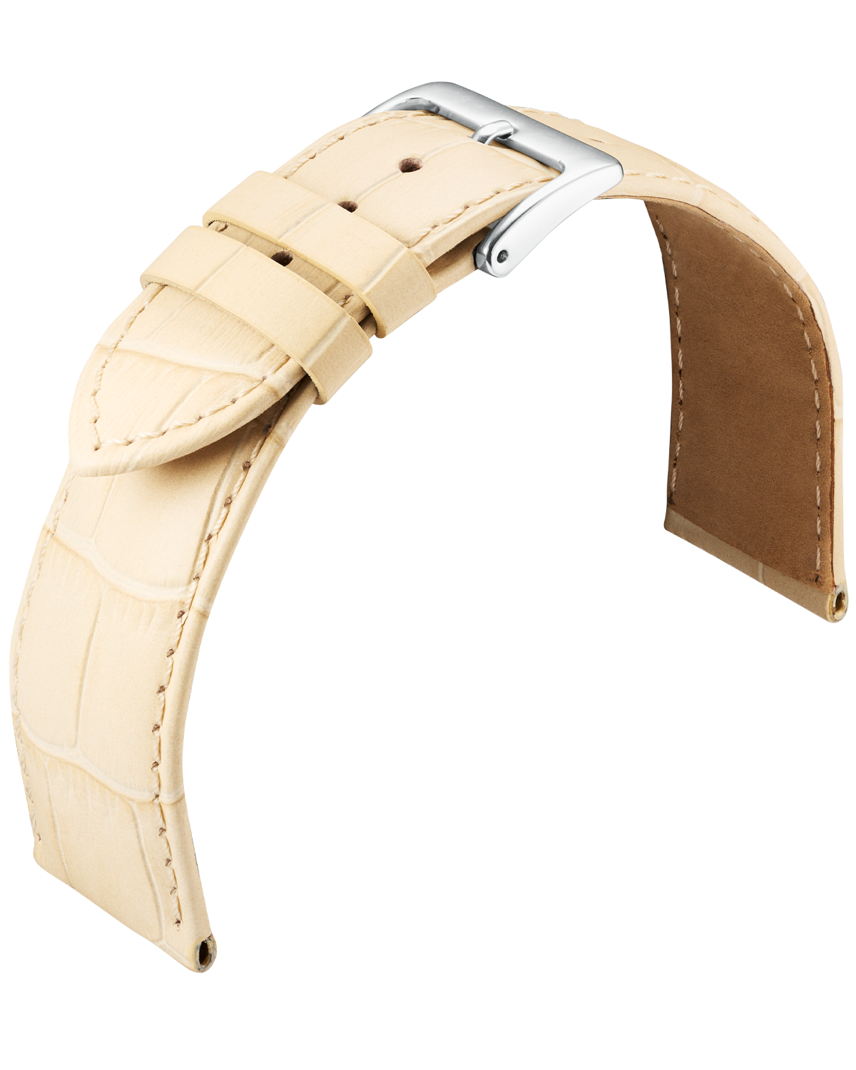 Louisiana-Kroko Optik auf Kalbleder geprägt. Leicht gepolstertes Band mit Naht und hautfreundlichem Futterleder, sowie Aluminium-Dornschließe.