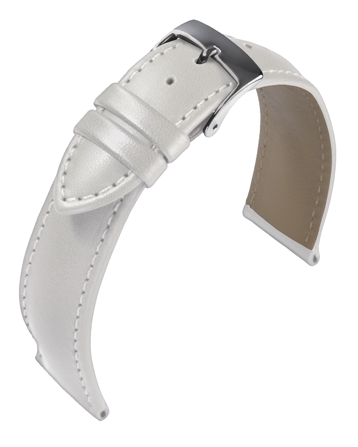 Hochwertiges, feines Kalbleder-Uhrarmband mit seidenglänzender Oberfläche. Rembordierte Ausführung, leicht gepolstert, hautfreundliches Nubuk-Futterleder und Edelstahl-Dornschließe.